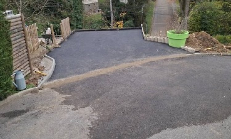 L’allée est ensuite recouverte d’un enrobé à chaud 2 couches, une solution robuste, parfaitement adaptée aux charges lourdes comme les camping-cars. Cette technique assure une finition propre, antidérapante et durable, même en cas d’intempéries ou de stationnement prolongé.